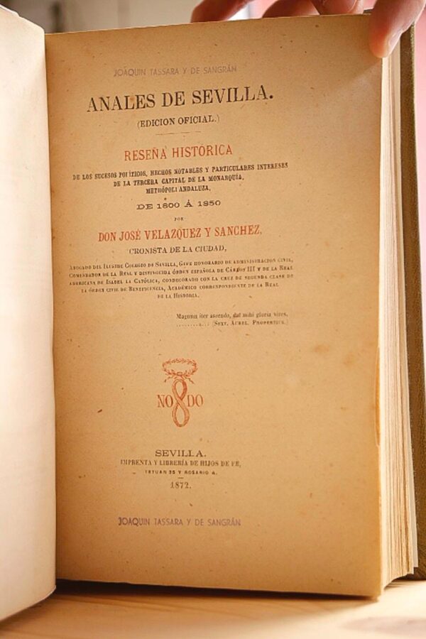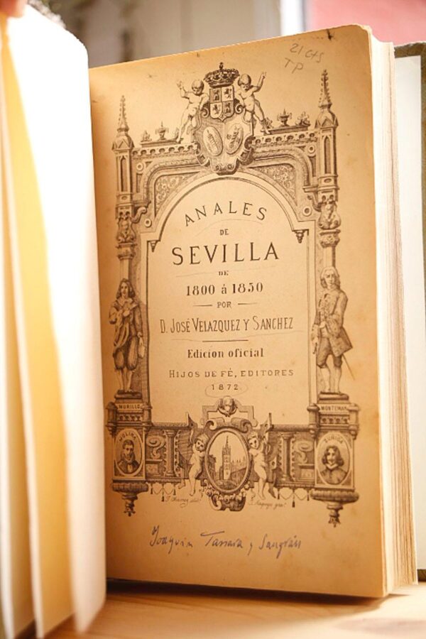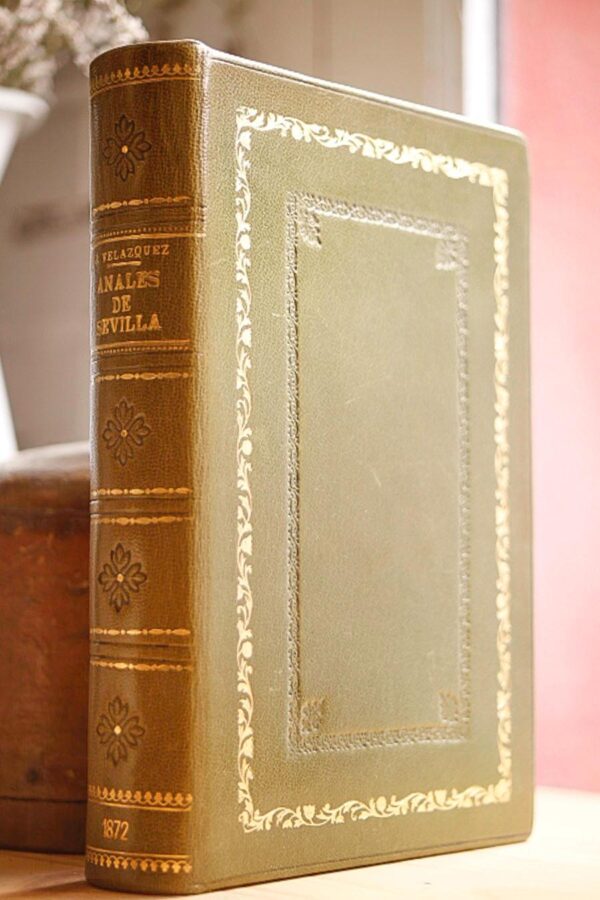 Publicado: Sevilla: Imprenta y Librería de Hijos de Fe, 1872 Autor: VELÁZQUEZ Y SÁNCHEZ, José. Título: Anales de Sevilla (Edición Oficial). Reseña Histórica de los sucesos políticos, hechos notables y particulares intereses de la Tercera Capital de la Monarquía. Metrópoli Andaluza. De 1800 a 1850 Encuadernación: Encuadernación de tapa dura Estado: Bien Información adicional: 4to. 740 pp + 12 láminas. Enc. en pleno marroquén verde con ruedas doradas y en seco en ambos planos.
