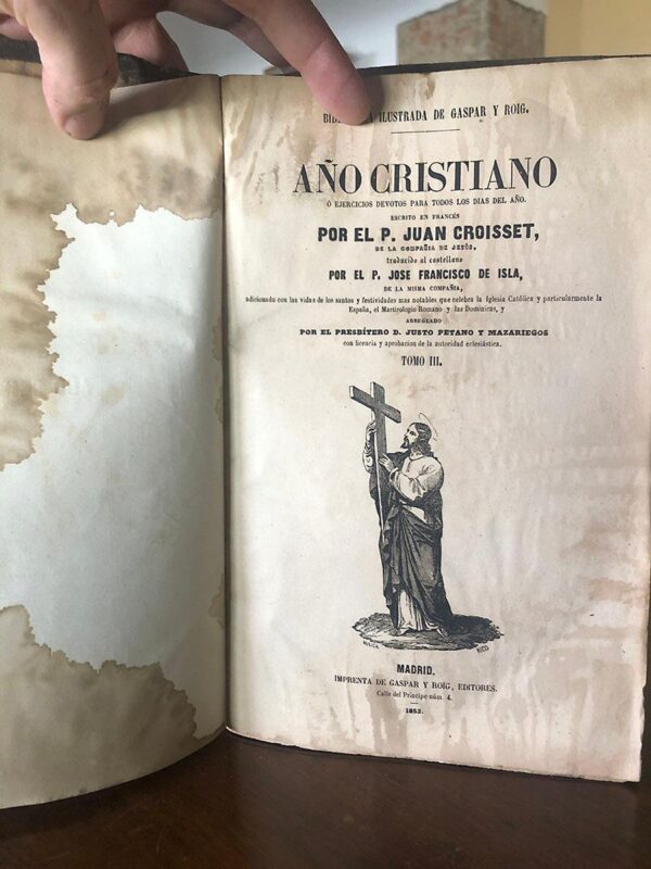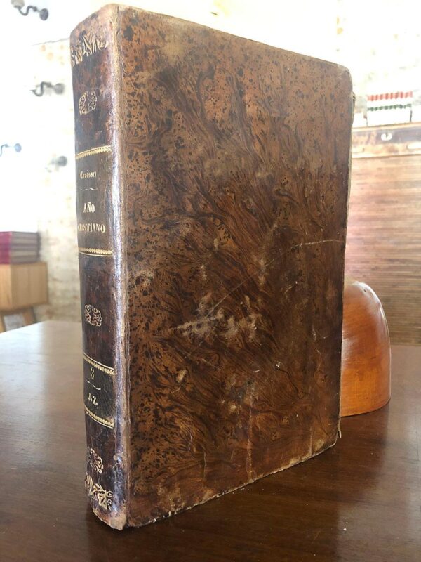 Publicado: Madrid: Gaspar y Roig. editores, 1853 Autor: CROISSET, Juan de. Título: Año Cristiano o ejercicios devotos para todos los días del año escrito en frances por... Tomo III Estado: Pobre Información adicional: 4to. 597 pp. + 4 h. Encuadernación plena pasta española. Ejemplar muy deteriorado que conserva, sin embargo, todos sus grabados y páginas.
