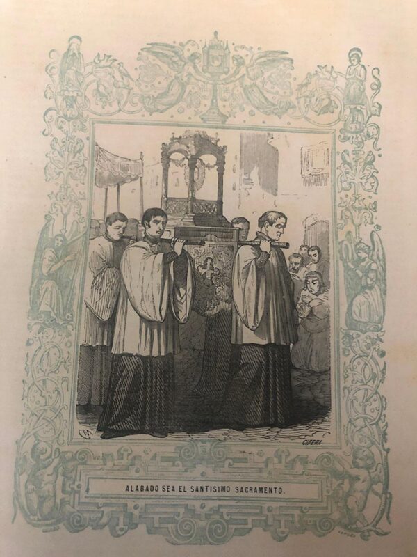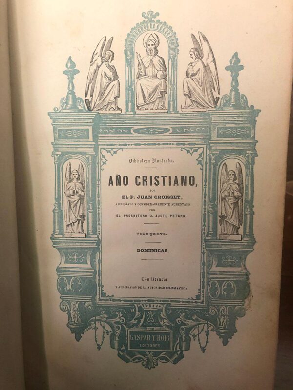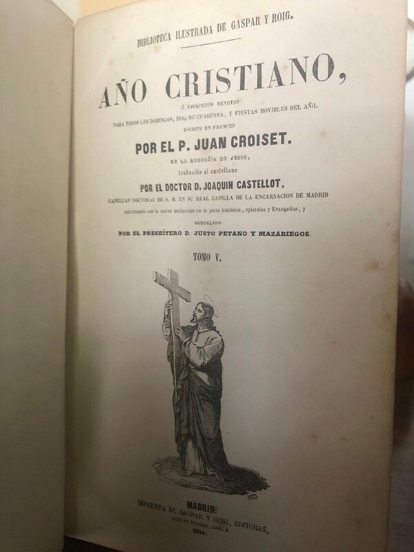 Publicado: Madrid: Gaspar y Roig. editores, 1854 Autor: CROISSET, Juan de. Título: Año Cristiano o ejercicios devotos para todos los días del año escrito en frances por... Tomo v. Encuadernación: Encuadernación de tapa dura Información adicional: 4to. 615 pp. + grabados. Encuadernación holandesa. Ejemplar muy fatigado aunque conserva todos los grabados orlados.