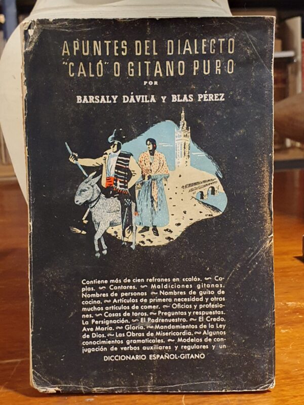 Apuntes del dialecto `caló´ o gitano puro. Contiene más de 100 refranes en caló – Coplas – Maldiciones gitanas – Nombres de guiso de cocina – Artículos de primera necesidad – […] y un diccionario español-gitano.