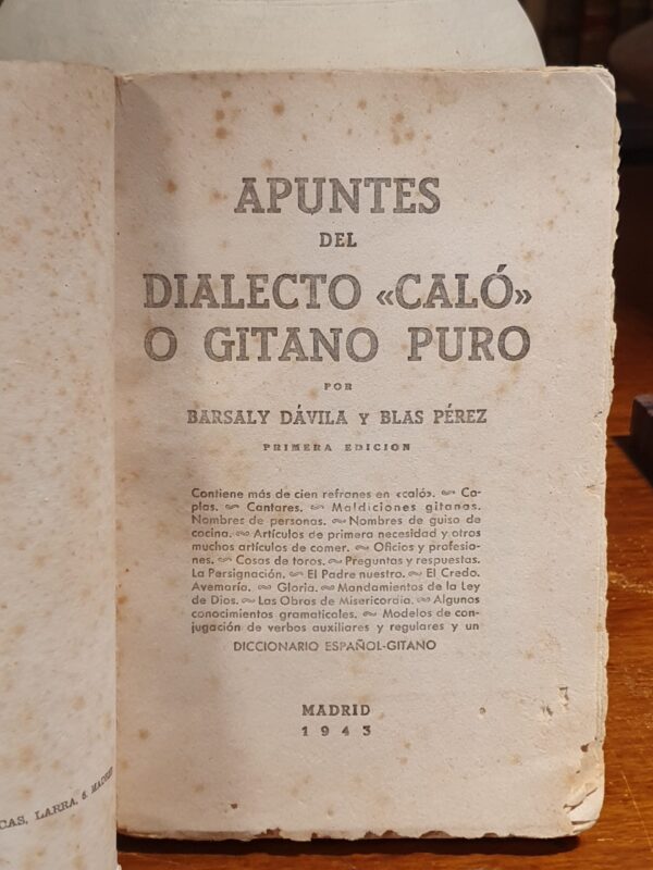 Publicado: Madrid: Artes Gráficas Diana 1943 Autor: DÁVILA, Barsaly / Blas PÉREZ. Título: Apuntes del dialecto `caló´ o gitano puro. Contiene más de 100 refranes en caló - Coplas - Maldiciones gitanas - Nombres de guiso de cocina - Artículos de primera necesidad - [...] y un diccionario español-gitano. Encuadernación: Rústica Estado: Aceptable Información adicional: 8vo. 197 pp. Encuadernación rústica. Algo fatigado y con las últimas páginas tintadas por transferencia.