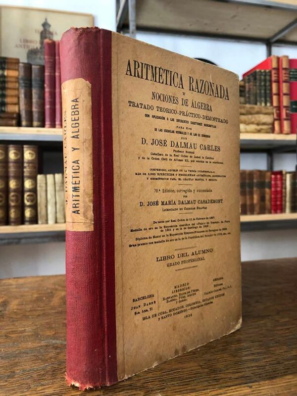 Publicado: Gerona: Dalmáu Carles, Pla S.A., 1935. Autor: DALMAU CARLES, José. Título: Aritmética Razonada y Nociones de Álgebra. Tratado teórico-práctio demostrado con aplicación a las diferentes cuestiones mercantiles para uso de las escuelas normales y de las de comercio. Más de 5000 ejercicios y problemas. Encuadernación: Encuadernación de tapa dura Estado: Aceptable Información adicional: 4to. 530 pp. Holandesa tela / cartoné editorial. Pequeñas rozaduras pero en general limpio y en buen estado.