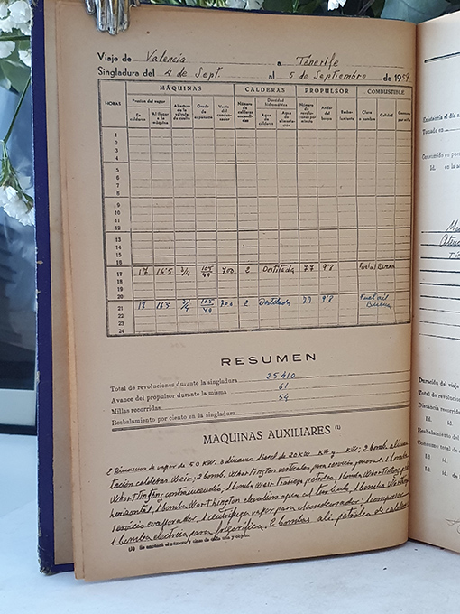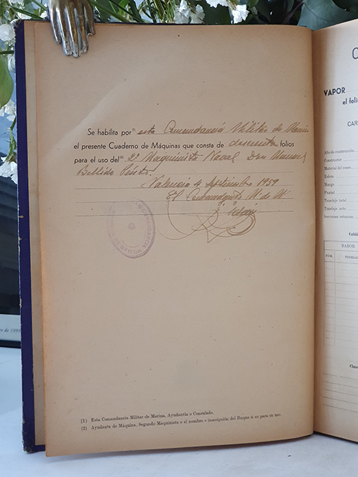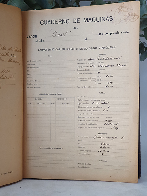Barco a vapor GENIL. Cuaderno de máquinas / motores para barcos a vapor. Año de 1959. Siendo Segundo Maquinista Naval D. Manuel Bellido Pinto.