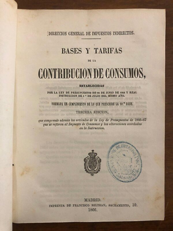Publicado: Madrid: Imprenta de Francisco Beltrán, 1866 Título: BASES y tarifas de la contribución de consumos establecidas por ley de presupuestos de 25 de Junio de 1864 y Real Instrucción de 1º de Julio del mismo año... Encuadernación: Sin encuadernar Estado: Aceptable Información adicional: 8vo. 66 pp. Sin encuadernar. Presentado en cubiertas provisionales de papel de aguas. Buen estado. Contiene varias tablas.