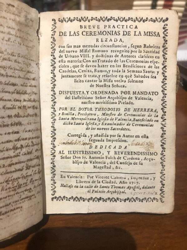 Publicado: Valencia: Vicente Cabrera, Impressor y Librero de la Ciudad, 1727 Autor: HERRERA, Theodosio. Título: BREVE PRÁCTICA DE AS CEREMONIAS DE LA MISSA REZADA, con sus más menudas circunstancias, según rúbricas del nuevo Missal Romano recognito por su Santidad Urbano VIII... Encuadernación: Encuadernación de tapa blanda Estado: Bien Información adicional: 8vo. 224 pp. Pergamino de época. Buen estado, las hojas de guarda están manuscritas en su totalidad.