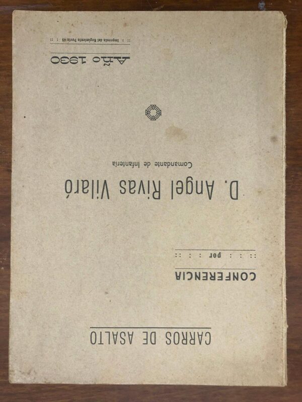 Publicado: Sin lugar de publicación, 1930 Autor: RIVAS VILARÓ, Ángel. Título: Carros de asalto. Conferencia por... (Historia, Características tácticas de los...) Encuadernación: Encuadernación de tapa blanda Información adicional: 4to. menor, 54 pp. Rústica con las cubiertas levemente deslucidas.