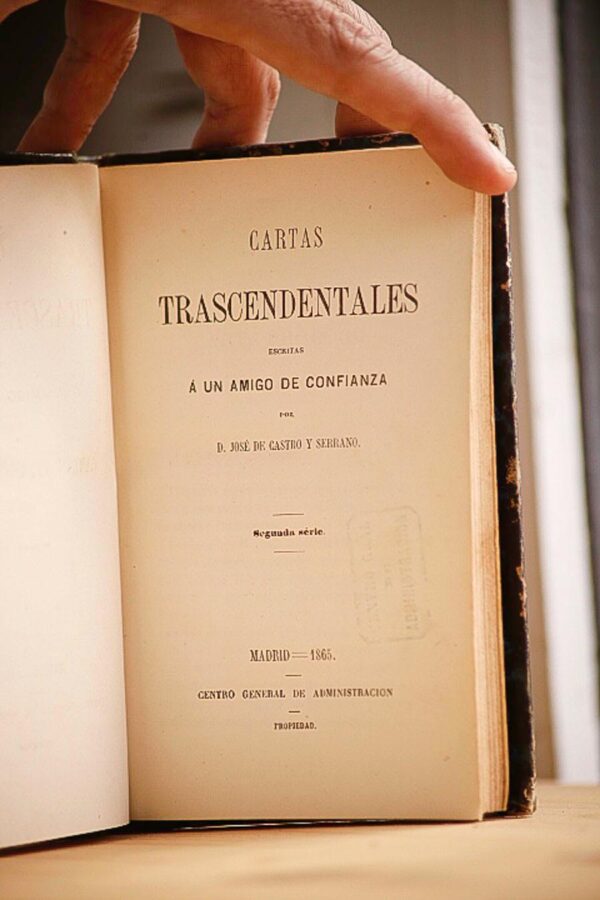 Publicado: Madrid: Centro General de Administración, 1865 Autor: CASTRO Y SERRANO, José. Título: Cartas trascendentales escritas a un amigo de confianza. Encuadernación: Encuadernación de tapa dura Estado: Aceptable Información adicional: 8vo. 235 pp. + 1h. Holandesa. Buen estado.