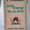 Publicado: Madrid: Mundo Latino 1929 Autor: STRINDBERG, Augusto. Título: Cinco dramas en un acto. Traducción Alejandro Rodríguez Álvarez. Encuadernación: Rústica Estado: Bien Información adicional: 8vo. 285 pp. + 3 h. Rústica un poco deslucida.