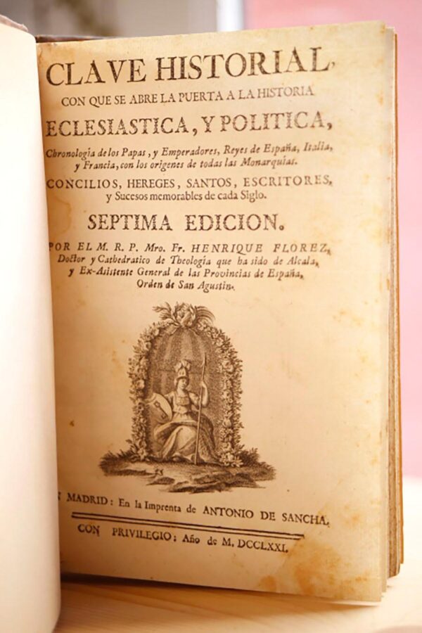 Publicado: Madrid: En la Imprenta de Don Antonio de Sancha, 1771 Autor: FLOREZ, Enrique. Título: CLAVE HISTORIAL CON QUE SE ABRE LA PUERTA A LA HISTORIA ECLESIASTICA, Y POLITICA... Información adicional: 8vo. Portada + 19h. + 440 pág. + 1 lám. Recia encuadernación en plena piel, pasta española del siglo XIX. Buen estado.