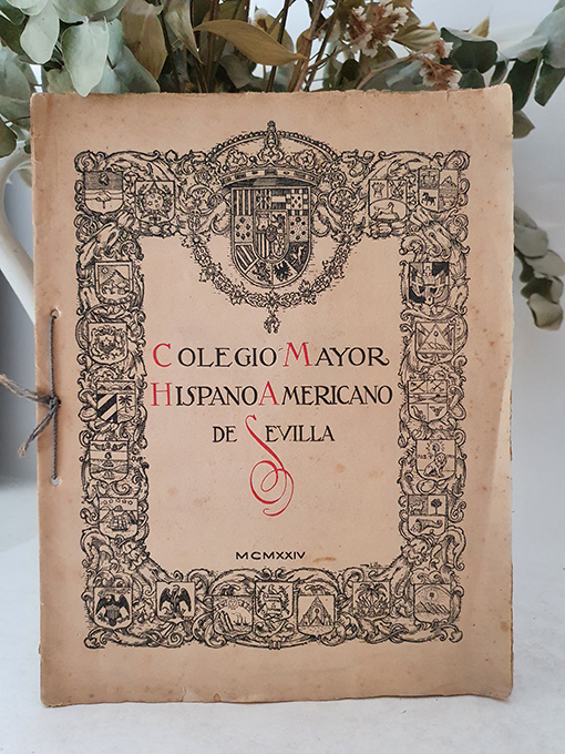 Publicado: PUBLICIDAD ARTÍSTICA HISPANIA 1924 Título: COLEGIO MAYOR HISPANO AMERICANO DE SEVILLA. Con retrato adherido de Alfonso XIII y de Miguel Primo de Rivera. Encuadernación: Rústica Estado: Bien Información adicional: Folio (28,5x22, cm), 24 pp. Encuadernación rústica unida por cordón gris. En buen estado, roturitas marginales.