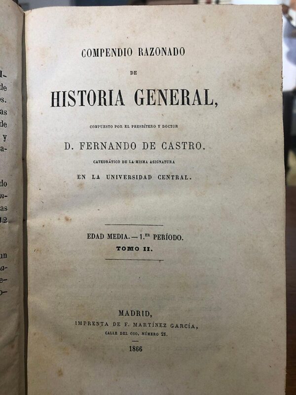 Publicado: Madrid: Imprenta de José María Pérez, 1866 Autor: CASTRO, Fernando de. Título: COMPENDIO RAZONADO DE HISTORIA GENERAL. Edad Media, 1er. periodo. Encuadernación: Encuadernación de tapa dura Estado: Aceptable Información adicional: 8vo. 541 pp. Holandesa de época. Interior en buen estado, Enc. con alguna rozadura..