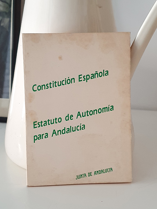 Publicado: Sevilla: Diputación Provincial 1985 Título: CONSTITUCIÓN ESPAÑOLA, ESTATUTO DE AUTONOMÍA PARA ANDALUCÍA, DECLARACIÓN UNIVERSAL DE LOS DERECHOS HUMANOS.- Prólogo de Gregorio Peces Barba. Dedicatoria autógrafa de quien fuera alcalde de Sevilla, José Rodríguez de la Borbolla y Camoyán. Encuadernación: Rústica Estado: Bien Información adicional: 8vo. 125 pp. Encuadernación rústica con manchas de óxido en cubiertas. Dedicatoria autógrafa del entonces alcalde de Sevilla, José Rodríguez de la Borbolla y Camoyán.