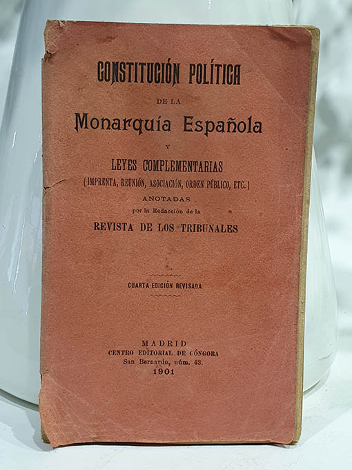 Publicado: Madrid: Centro Editorial de Góngora 1901 Título: Constitución Política de la Monarquía Española y Leyes Complementarias (Imprenta, Reunión, Asociación, Orden Público Etc. Anotadas por la redacción de la Revista De Los Tribunales. Encuadernación: Rústica Estado: Aceptable Información adicional: 16vo. 128 pp. + 31 pp. Rústica, rozaduras.