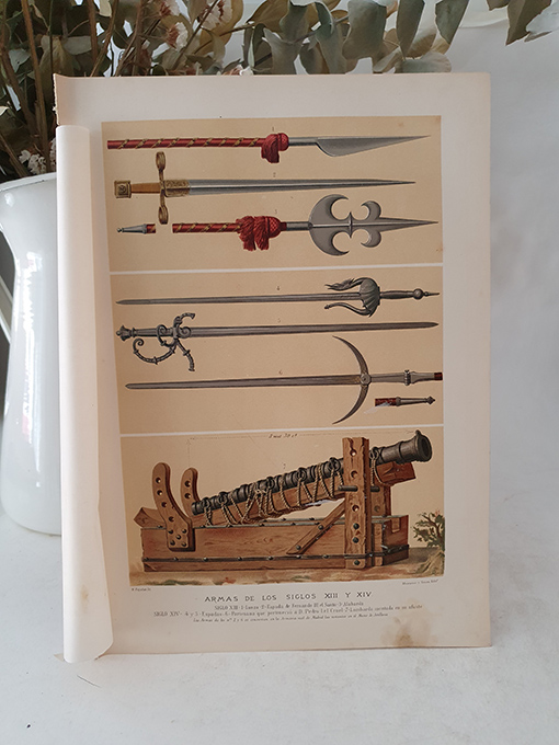 Título: [Cromolitografía] Armas de los siglos XIII y XIV. S.XIII: Lanza, espada de Fernando III el Santo y Alabarda. S.XIV: Partesana de Pedro I el Cruel... Estado: Bien Información adicional: Folio, 33x24 cm. Buen estado. Perfecta para enmarcar.