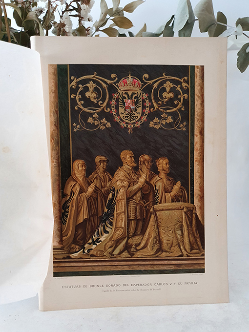 Título: [Cromolitografía] Carlos V y su familia. Estatuas de bronce dorado, Monasterio de El Escorial. Encuadernación: Sin encuadernar Estado: Bien Información adicional: Folio, 33x24 cm. Buen estado. Perfecta para enmarcar.