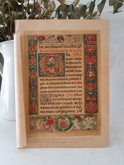 Título: [Cromolitografía] Copia de una página del llamado Misal Rico, usado por el Cardenal Cisneros. Encuadernación: Sin encuadernar Estado: Bien Información adicional: Folio, 33x24 cm. Buen estado. Perfecta para enmarcar.