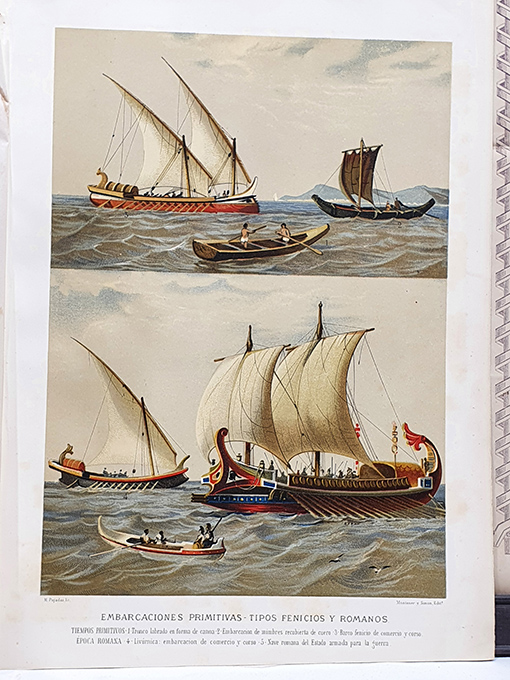 Publicado: Madrid: Montaner y Simón 1877 Autor: PUJADAS, M. Título: [Cromolitografía] Embarcaciones primitivas. Tipos fenicios y romanos. Estado: Bien Información adicional: Folio, 24 x 33 cm. Buen estado. Perfecta para enmarcar.