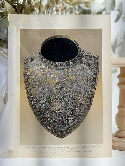 [Cromolitografía]. Magnífico Gorguerín de hierro con relieves de plata sobre fondo de oro. Perteneciente a Felipe II.