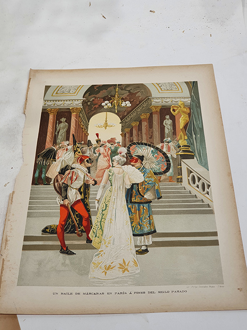 Título: [Cromolitografía] Un baile de máscaras en París a finales del s. XVIII Estado: Bien Información adicional: Folio, 24 x 33 cm. Buen estado. Perfecta para enmarcar.