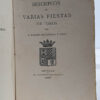 Publicado: Sevilla: Imprenta de E. Rasco 1889 Autor: SARASA Y ARCE, Fermín. Título: Descripción de varias Fiestas de Toros. Encuadernación: Rústica Estado: Muy bien Información adicional: 8vo. 52 pp. + 6 h. Rústica. Tirada de 100 ejemplares en papel de hilo. Se editaron sólo 100 copias a expensas del Marqués de Xerez de los Caballeros. Raro.