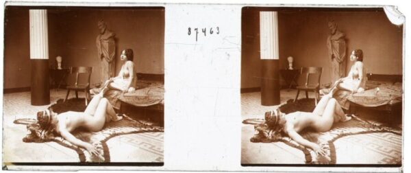 Desnudo artístico estereoscópico en cristal. Fotografía estereoscópica. Jules Richard. The Atrium.