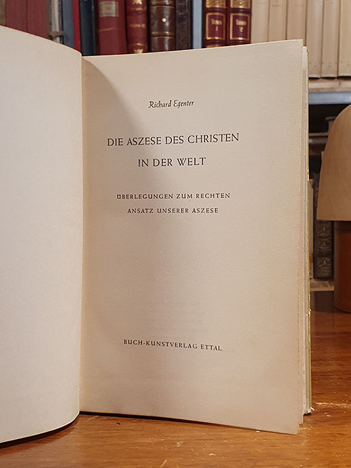 Publicado: Buch Kunstverlag 1956 Autor: Egenter, Richard: Título: Die Aszese des Christen in der Welt. Überlegungen zum Rechten Ansatz unserer Aszese. Encuadernación: Encuadernación de tapa dura Estado: Bien Información adicional: 8vo. 236 pp. + 1 h. Original cloth binding with dust jacket. Good condition.