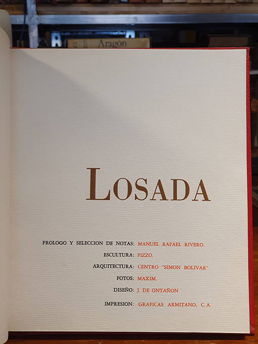 Publicado: Caracas: Centro Simón Bolívar 1972 Autor: RIVERO, Manuel Rafael [Prólogo y selec. de notas] Título: Diego de Losada. Encuadernación: Encuadernación de tapa dura Estado: Muy bien Información adicional: 4to. 48 páginas sin numerar. Encuadernación holandesa de la época con nervios y titulo en lomo. En impecable estado. Homenaje a Diego de Losada, Fundador de Caracas. Ilustraciones de Escultura Homenaje de Pizzo, Fotos Maxim. Páginas sin numerar.