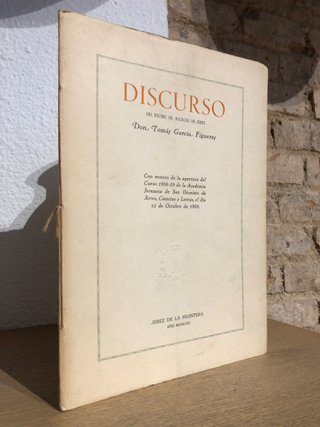 Publicado: Jerez: Jerez Industrial, 1958 Autor: GARCIA FIGUERAS, Tomás. Título: Discurso del Excmo. Sr. ALcalde de Jerez de la Frontera, D... Con motivo de la apertura del Curso 1958-1959 de la Academia Jerezana de San Dionisio de Artes, Ciencias y Letras el día 12 de Octubre de 1958. Encuadernación: Rústica Estado: Bien Información adicional: 4to. 56 pp. Enc. editorial. Buen estado.