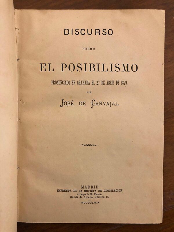 Publicado: Madrid: Imprenta de la Revista de Legislación, 1879 Autor: CARVAJAL, José. Título: Discurso sobre El Posibilismo. Pronunciado en Granada el 27 de Abril de 1879. Encuadernación: Sin encuadernar Estado: Aceptable Información adicional: 8vo. 73 pp. Sin encuadernar. Presentado en cubiertas provisionales de papel de aguas. Buen estado.