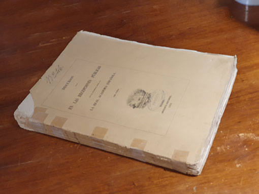 Publicado: Madrid: Imprenta Nacional 1860 Autor: OLIVÁN, Alejandro / Nicomedes PASTOR DÍAZ / Eugenio de HARTZENBUSCH / Donoso CORTÉS / José Joaquín de MORA / Javier de QUINTO / Fermín de la PUENTE y APECECHEA / José CAVEDA / Antonio FERRER DEL RÍO. Título: Discursos leídos en las recepciones públicas que ha celebrado desde 1847 la Real Academia Española. Tomo 2. Estado: Aceptable Información adicional: Folio, 428 pp. + 1 h. Encuadernación rústica con restauraciones en papel fixo en lomo. Intonso, incluye