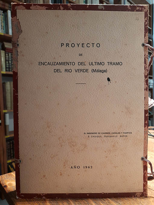 Autor: FRANQUELO RAMOS, Enrique. Título: [DOCUMENTO] Proyecto de encauzamiento del último tramo del Rio Verde (Málaga). Año de 1962. Encuadernación: Encuadernación de tapa dura Estado: Muy bien Información adicional: Carpeta en Folio conteniendo tres documentos a saber: 1* Memoria (Con dos anejos) 2* Planos [1. Plano de situación; 2. Planta; 3. Perfil longitudinal. 4. Perfiles transversales; 5. Perfiles, tipos y detalles constructivos]. 3* Presupuesto. Buen estado.