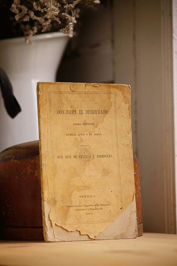 Publicado: Sevilla: La Andalucía, 1865 Autor: VELILLA y RODRÍGUEZ, José. Título: Don Jaime el desdichado. Drama. Encuadernación: Rústica Estado: Pobre Información adicional: 8vo. 59 pp. 2 hojas. Sin encuadernar. Fatigado.