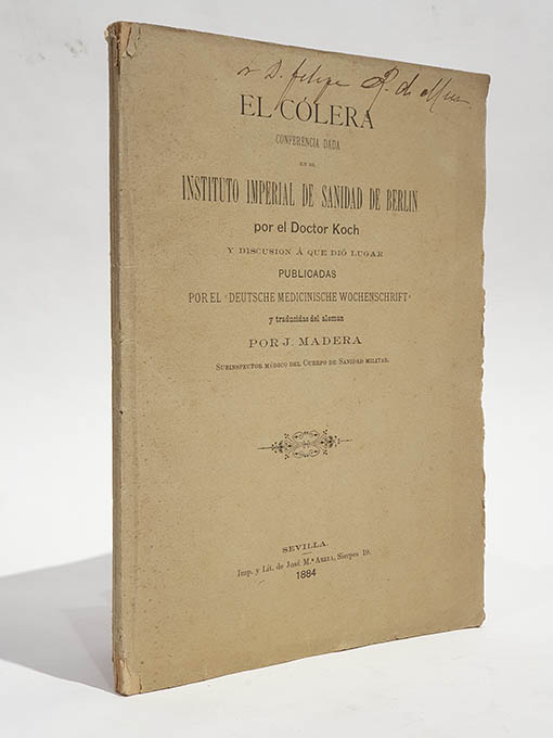 Publicado: Sevilla: Imp. y Lit de José María Ariza, 1884 Autor: KOCH. Título: El Cólera. Conferencia dada en el Instituto Imperial de Sanidad de Berlín por el Dr... Y discusión a que dio lugar- Encuadernación: Rústica Información adicional: 8vo. 114 pp. Rústica. Se entrega con sobrecubierta de papel vegetal para su mejor coservación.