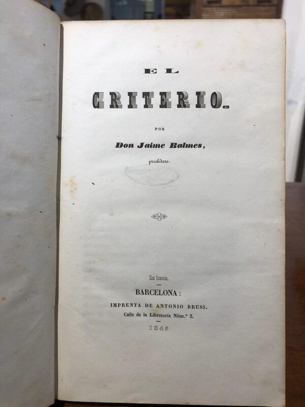 Publicado: Barcelona: Imprenta de Antonio Brusch, 1845 Autor: BALMES, Jaime. Título: El criterio. Encuadernación: Encuadernación de tapa dura Estado: Bien Información adicional: 4to. menor, 384 pp. + 1 h. Plena piel pasta española de época con lomo y plano rozados. Interior limpio y recio.