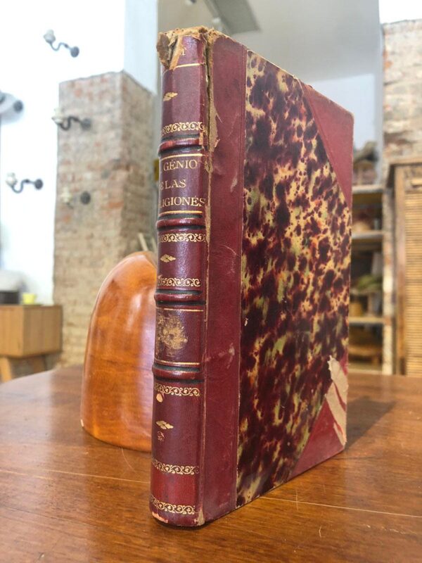 Publicado: Sevilla-Madrid: Librería de Victoriano Suárez, ca. 1890 Autor: QUINET, Edgar. Título: El genio de las religiones. Encuadernación: Encuadernación de tapa dura Estado: Aceptable Información adicional: 8vo. 514 pp. Encuadernación holandesa de época con nervios, fatigada, interior bien.