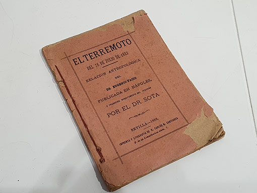 Publicado: Sevilla: Imprenta y Litografía de Carlos M. Santigosa 1883 Autor: FACIO, Eugenio. Título: El Terremoto del 28 de Julio de 1883. Relación antropológica del D... Publicada en Nápoles y traducida directamente del italiano por el Dr. Sota. Encuadernación: Rústica Estado: Pobre Información adicional: 8vo. 91 pp. + 2 h. Rústica fatigada aunque completo.