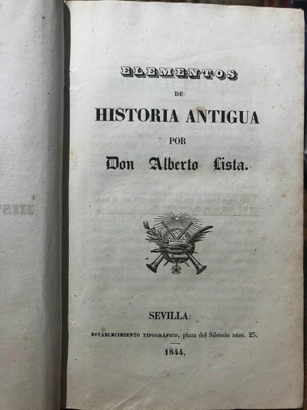 Publicado: Sevilla: Establecimiento Tipográfico, 1844 Autor: LISTA, Alberto. Título: Elementos de Historia Antigua. Encuadernación: Encuadernación de tapa dura Estado: Bien Información adicional: 8vo. 395 pp. + 1 h. Holandesa con puntas de época. Levemente deslucida. Interior bien.