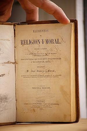 Publicado: Madrid: Imprenta de la Publicidad, 1849 Autor: SOMOZA LLANOS, José. Título: Elementos de religión y moral para que pueda servir en las escuelas del Reino. Encuadernación: Encuadernación de tapa dura Estado: Aceptable Información adicional: 12vo. 446 pp. 3h. Encuadernación pasta española de época. Dibujos de niños en guardas, firmas... Aceptable estado.