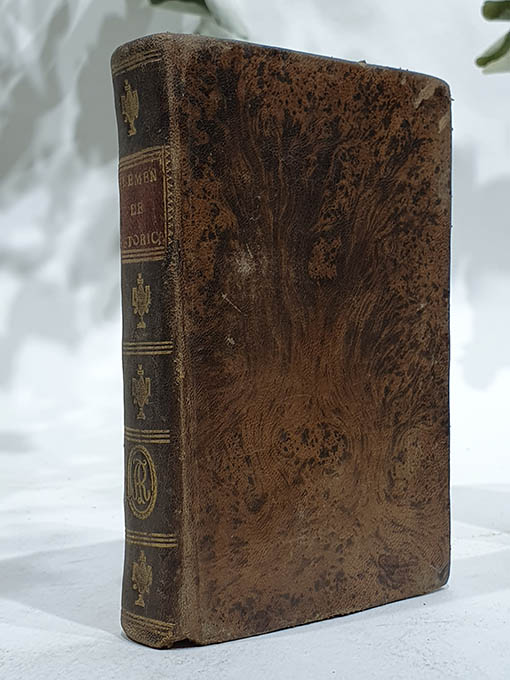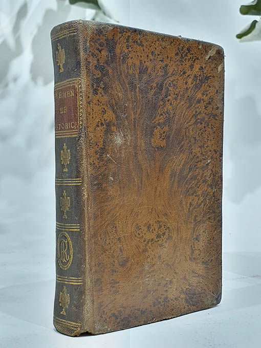 Publicado: Madrid: Oficina de Don Gerónimo Ortega e Hijos de Ibarra 1791 Autor: HORNERO, Calixto. Título: Elementos de retórica con exemplos latinos de Cicerón y castellanos de Fr. Luis de Granada para uso de las Escuelas por... Encuadernación: Encuadernación de tapa dura Estado: Bien Información adicional: 16vo. 4 h. + 263 pp. [Más 63 pp. con: Frases de pura latinidad para uso de las Escuelas Pías, que carece de portada y pie de imprenta] Plena pasta española de época. Cortes tintados, portada y última página de la primera obra con restauraciones.