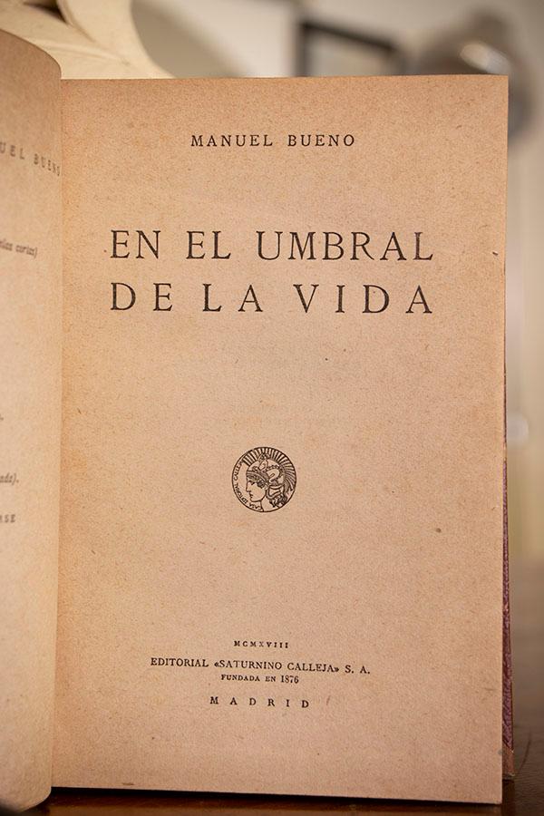 Publicado: Madrid: Saturnino Calleja, 1918 Autor: BUENO, Manuel. Título: En el umbral de la vida. Encuadernación: Encuadernación de tapa dura Estado: Muy bien Información adicional: 8vo. 247 pp. + 1 hoja. Encuadernación holandesa tela-cartoné. Mínimas rozaduras, en general en muy buen estado.