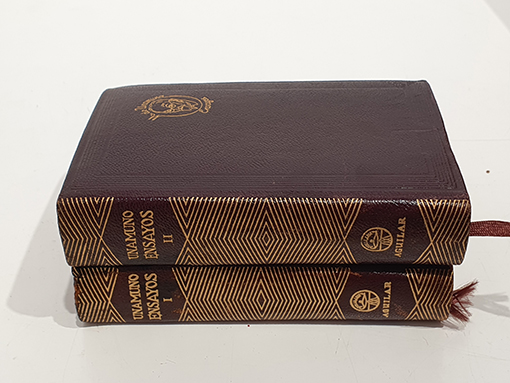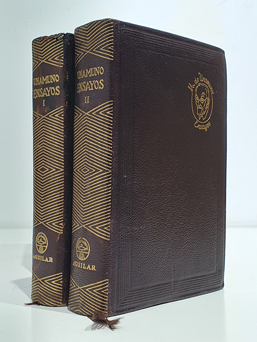 Publicado: Madrid: Aguilar, 1951 Autor: UNAMUNO, Miguel de. Título: Ensayos. 2 Vols. Prólogo de Bernardo G. de Candamo. Colección Joya Núm. 21 y 22. Encuadernación: Encuadernación de tapa dura Estado: Muy bien Información adicional: 8vo. I: 1 retrato del autor + 1073 pp. II: 2 láminas + 1240 pp. Encuadernación en plena piel editorial marrón. Cortes dorados. Excelente estado.