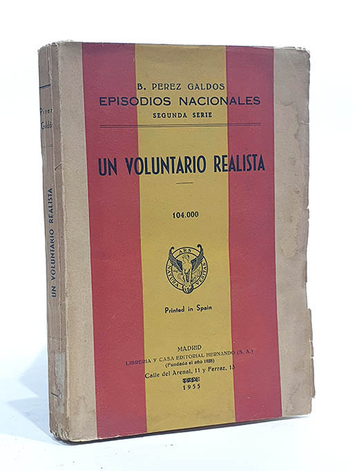 Publicado: Madrid: Hernando 1955 Autor: PÉREZ GALDÓS, Benito. Título: Episodios Nacionales Segunda Serie. Un voluntario realista. Encuadernación: Rústica Estado: Bien Información adicional: 8vo. 285 pp. Rústica con la bandera rojigualda en cubierta delantera. Leves rozaduras y manchitas en cubiertas. Interior en buen estado.