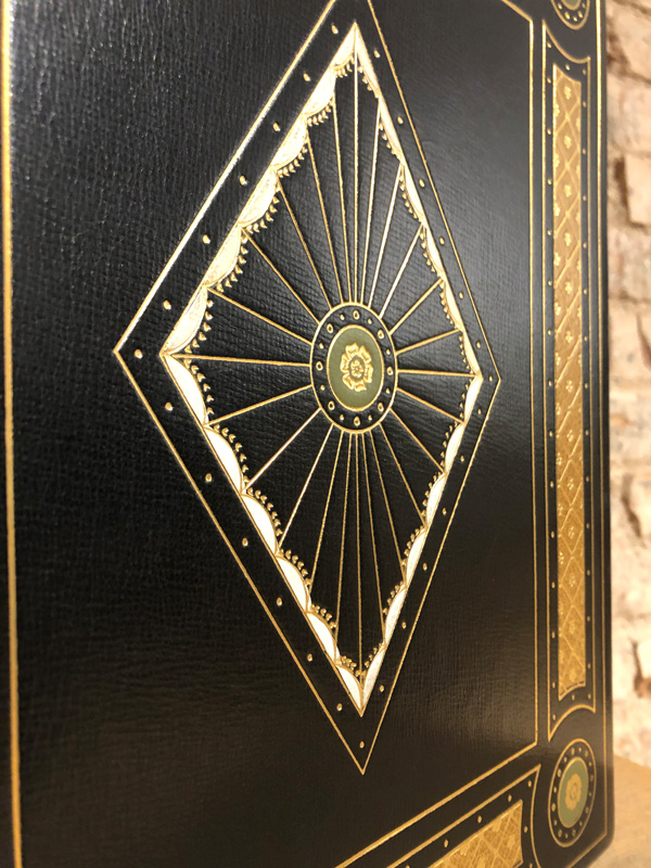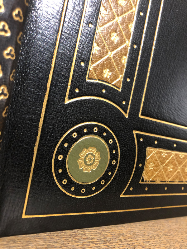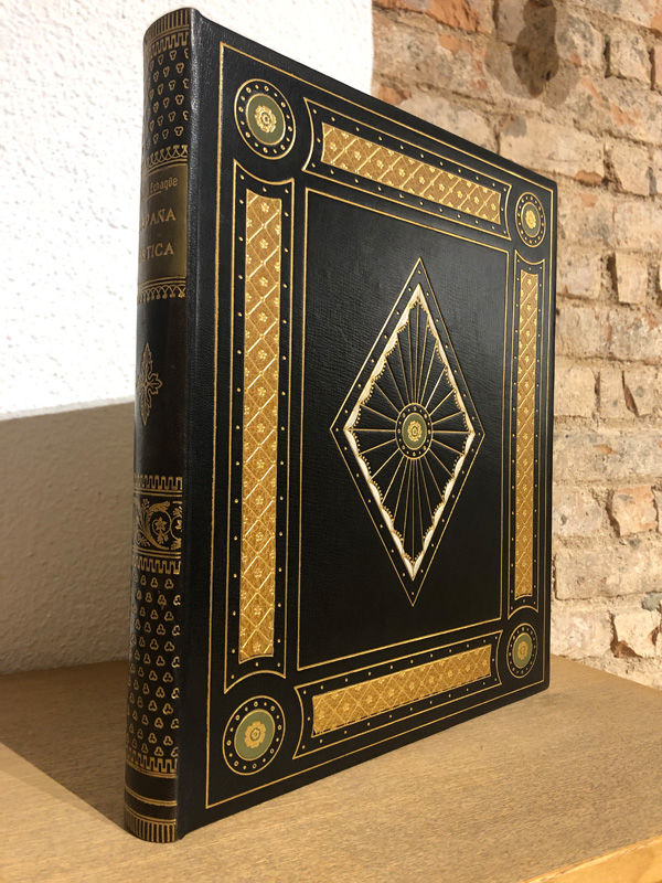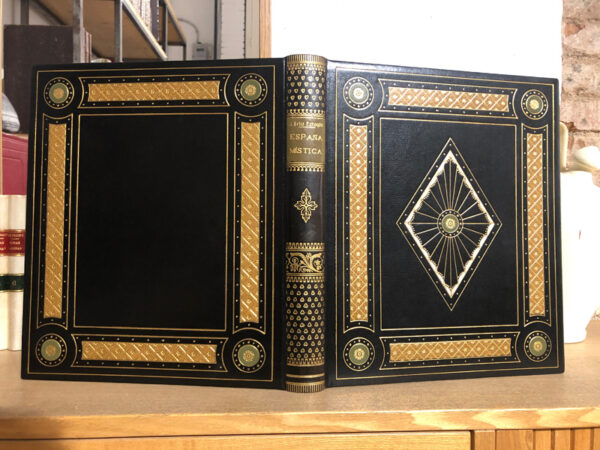 Publicado: Madrid: Publicaciones Ortiz Echagüe, 1964 Autor: ORTIZ ECHAGÜE, José. Título: España Mística. Con 289 láminas en huecograbado y 28 planchas en Color. Prólogo de Miguel Herrero García. [¿Encuadernación Galván?] Encuadernación: Encuadernación de tapa dura Estado: Muy bien Información adicional: Folio, 276 pp. Encuadernación en pleno marroquén negro con mosaicos en verde y beige en ambos planos así como hierros y ruedas doradas enmarcando a estos. Corte superior tintado. Guardas de moaré y contra-cantos con ruedas en seco. Dada la procedencia del ejemplar, Cádiz, posible encuadernación del taller de Galván.
