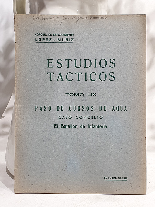 Publicado: Madrid: Editorial Gloria 1949 Autor: LÓPEZ MUÑIZ. Título: Estudios Tácticos, Tomo LIX. Paso de cursos de agua. Caso concreto: El Batallón de Infantería. Encuadernación: Rústica Estado: Muy bien Información adicional: 8vo. 67 pp. Rústica, perfecto estado.