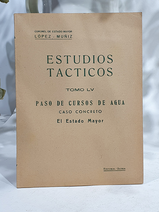 Publicado: Madrid: Editorial Gloria 1948 Autor: LÓPEZ MUÑIZ. Título: Estudios Tácticos, Tomo LV. Paso de cursos de agua. Caso concreto. El Estado Mayor. Encuadernación: Rústica Estado: Muy bien Información adicional: 8vo. 62 pp. + Plano. Rústica, perfecto estado.