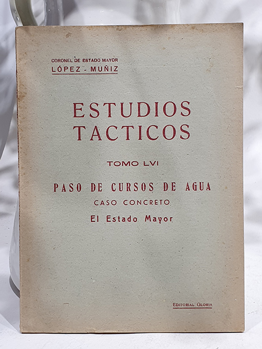 Publicado: Madrid: Editorial Gloria 1948 Autor: LÓPEZ MUÑIZ. Título: Estudios Tácticos, Tomo LV. Paso de cursos de agua. Caso concreto. El Estado Mayor. Encuadernación: Rústica Estado: Muy bien Información adicional: 8vo. 62 pp. + Plano. Rústica, perfecto estado.