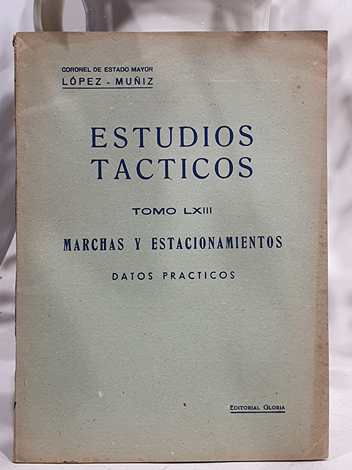 Publicado: Madrid: Editorial Gloria 1950 Autor: LÓPEZ MUÑIZ. Título: Estudios Tácticos, Tomo LXIII. Marchas y estacionamientos. Datos prácticos. Encuadernación: Rústica Estado: Muy bien Información adicional: 8vo. 62 pp. Rústica, perfecto estado.