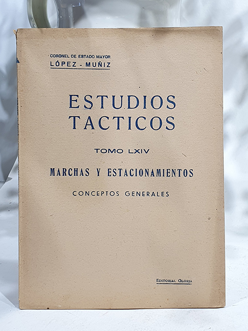 Publicado: Madrid: Editorial Gloria 1950 Autor: LÓPEZ MUÑIZ. Título: Estudios Tácticos, Tomo LXIV. Marchas y estacionamientos. Conceptos generales. Encuadernación: Rústica Estado: Muy bien Información adicional: 8vo. 61 pp. Rústica, perfecto estado.