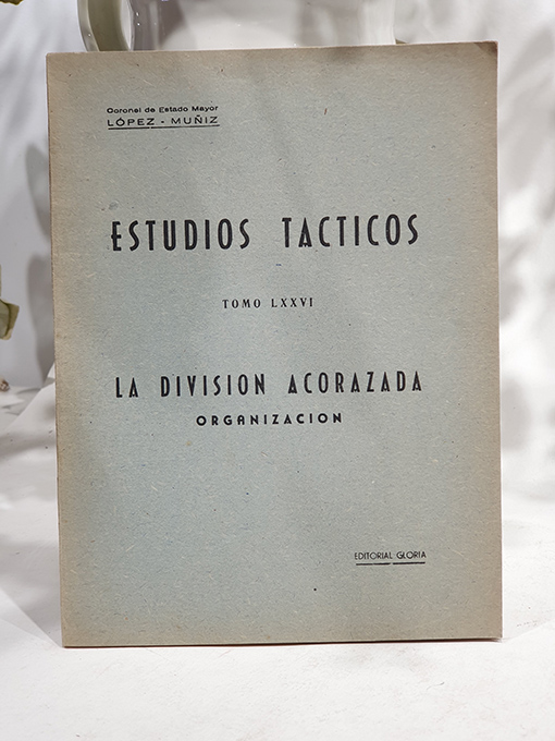 Publicado: Madrid: Editorial Gloria 1951 Autor: LÓPEZ MUÑIZ Título: Estudios Tácticos, Tomo LXXVI. La división acorazada. Organización Encuadernación: Rústica Estado: Muy bien Información adicional: 8vo. 67 pp. Rústica, perfecto estado.