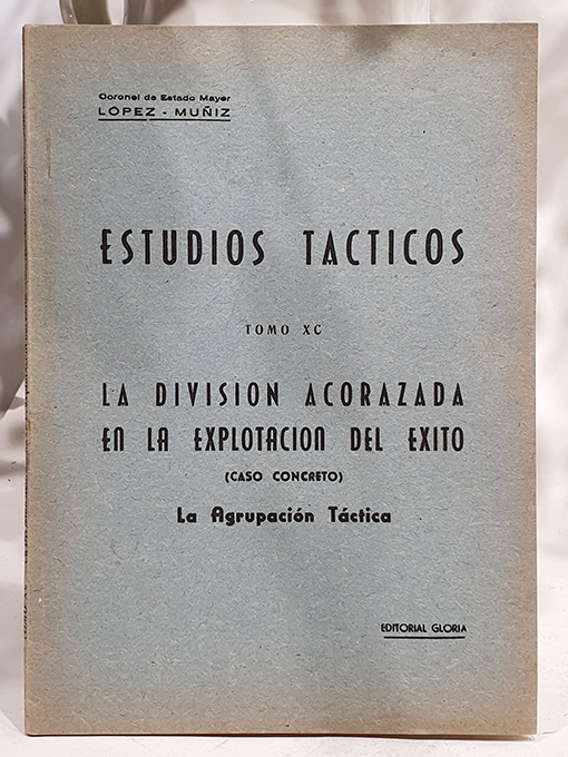 Publicado: Madrid: Editorial Gloria 1953 Autor: LÓPEZ MUÑIZ Título: Estudios Tácticos, Tomo XC. La división acorazada en la explotación del éxito. Caso concreto: La agrupación técnica. Encuadernación: Rústica Estado: Muy bien Información adicional: 8vo. 60 pp. + mapa. Rústica, perfecto estado.